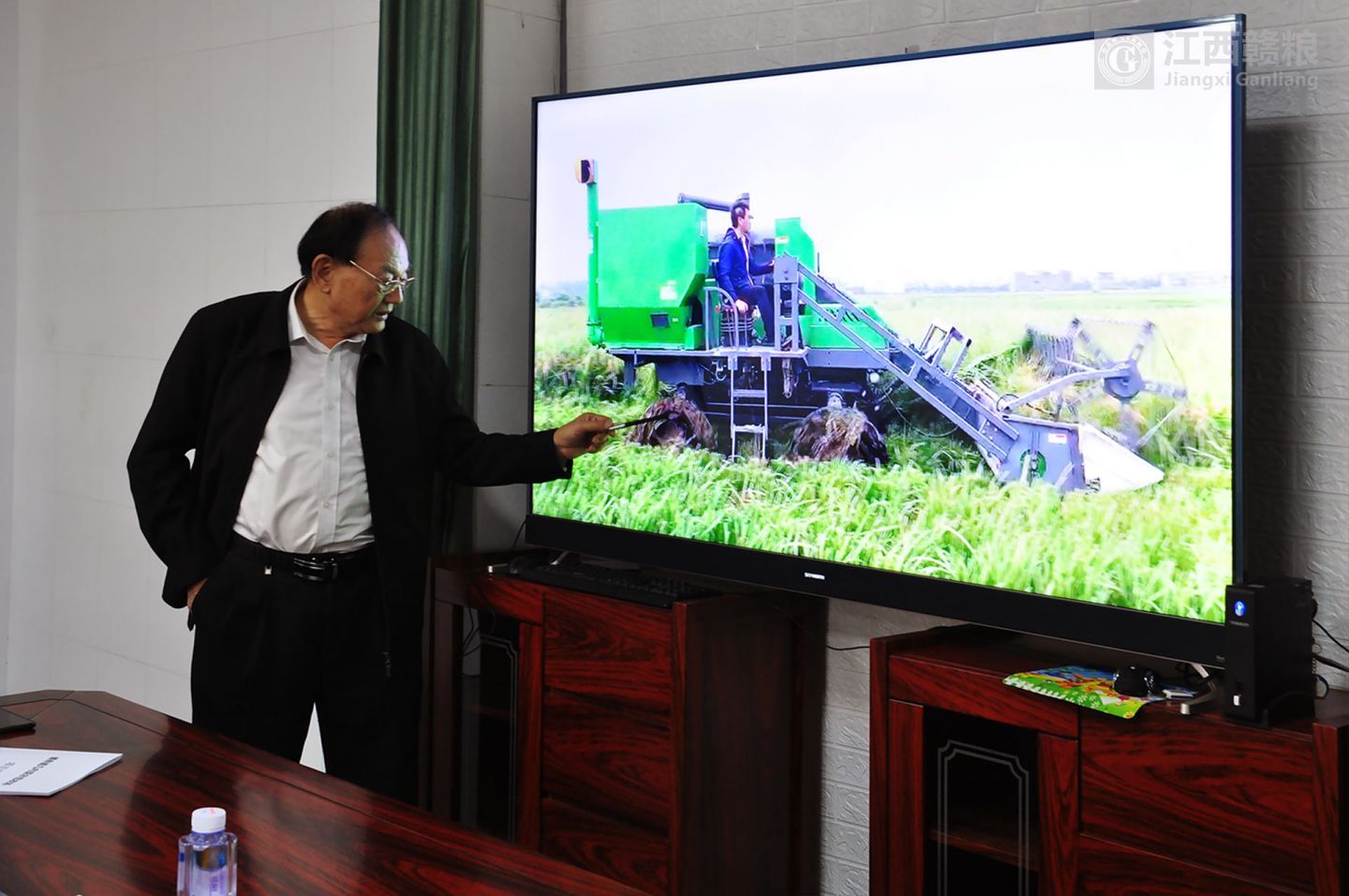 隨后,院士一行在贛糧公司院士工作站進(jìn)行水稻“優(yōu)質(zhì)品種+高產(chǎn)栽培技術(shù)+全程機(jī)械化”配套技術(shù)融合研討,院士工作站向院士、領(lǐng)導(dǎo)、專(zhuān)家一行詳細(xì)匯報(bào)了贛糧國(guó)內(nèi)外項(xiàng)目實(shí)施進(jìn)展情況。三位院士聽(tīng)取匯報(bào)后,先后進(jìn)行了認(rèn)真指導(dǎo)。會(huì)上,羅錫文院士展示了團(tuán)隊(duì)最新研究的第三代輪式水稻收割機(jī),對(duì)解決再生稻第一季機(jī)收碾壓?jiǎn)栴}有很好的效果。