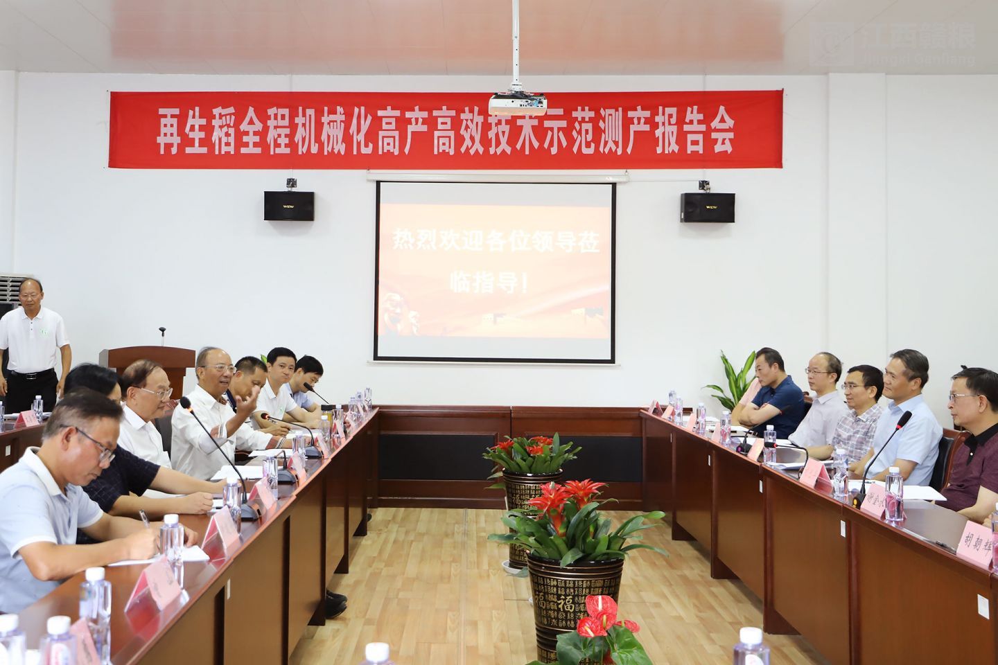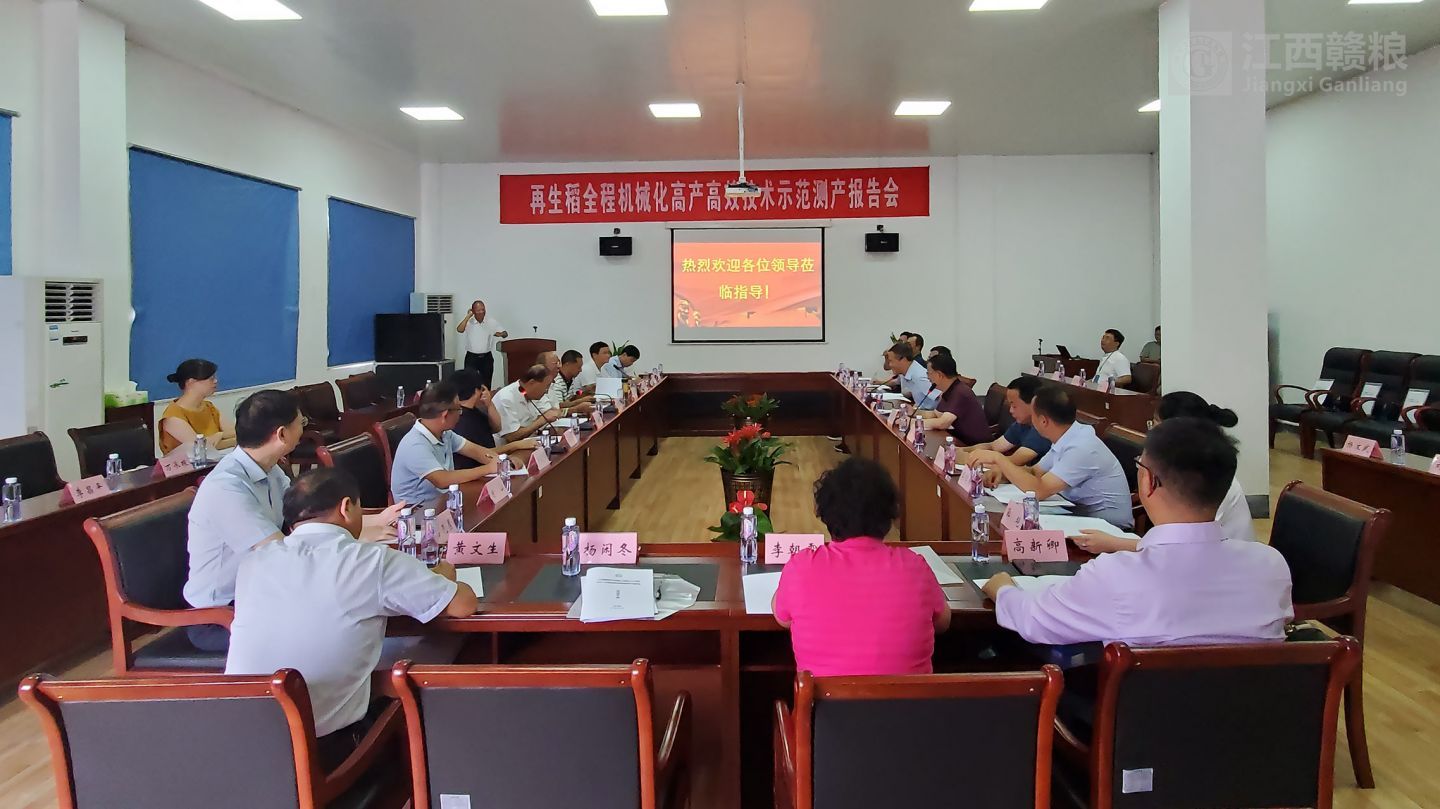 隨后,院士、領(lǐng)導(dǎo)一行在贛糧公司觀看了公司圖片展并在公司院士工作站學(xué)術(shù)報(bào)告廳進(jìn)行座談。江西贛糧高科技有限公司謝鴻基總經(jīng)理對(duì)院士、領(lǐng)導(dǎo)一行蒞臨指導(dǎo)表示熱烈歡迎。座談會(huì)上,謝院士向江西省科協(xié)、江西省農(nóng)業(yè)農(nóng)村廳等有關(guān)單位表示感謝,感謝各部門對(duì)贛糧院士工作站一直以來的支持與幫助,同時(shí)也希望贛糧院士工作站在各位領(lǐng)導(dǎo)的支持下能更上一層樓。羅錫文院士表示贛糧公司院士工作站實(shí)施推廣再生稻模式有三大優(yōu)勢(shì):一是品種,選用謝華安院士選育的再生稻新品種無論是產(chǎn)量水平還是稻米品質(zhì)都有很高的推廣價(jià)值;二是采用機(jī)直播方式進(jìn)行再生稻播種;三是采用再生稻專用收割機(jī)收割。表現(xiàn)出再生稻全程機(jī)械化高產(chǎn)高效的示范模式,非常符合當(dāng)前水稻生產(chǎn)需求。
