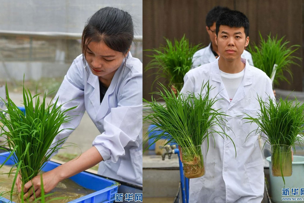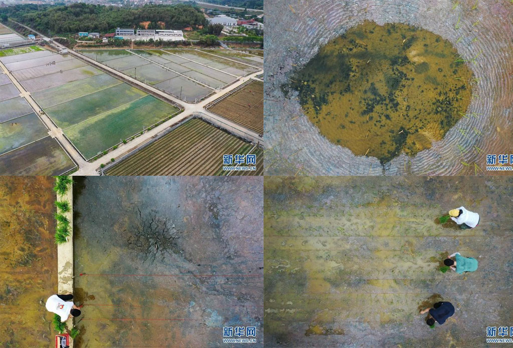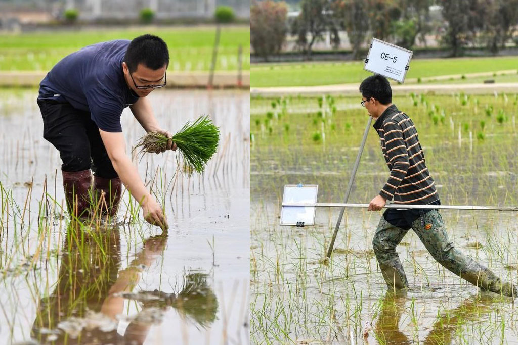 (左圖)研究人員在廣州增城華南農(nóng)業(yè)大學試驗田插種嫦娥五號搭載的太空稻秧苗。