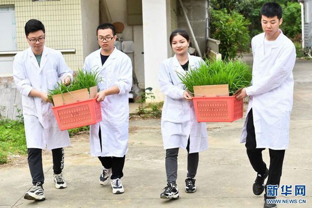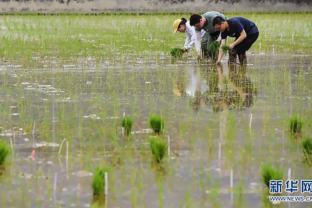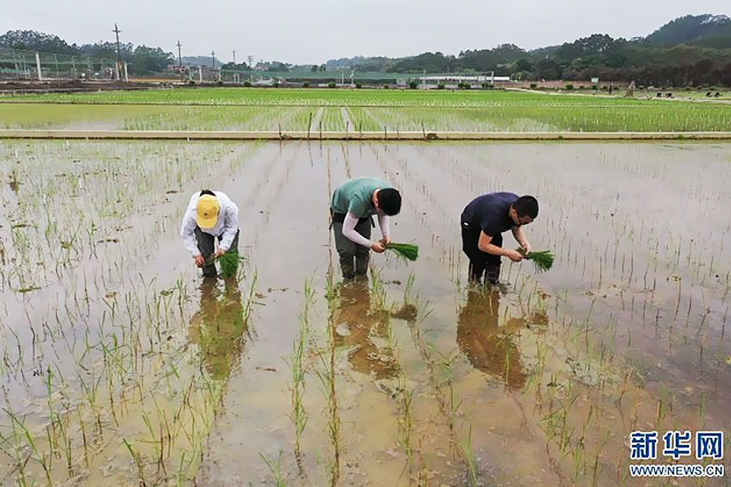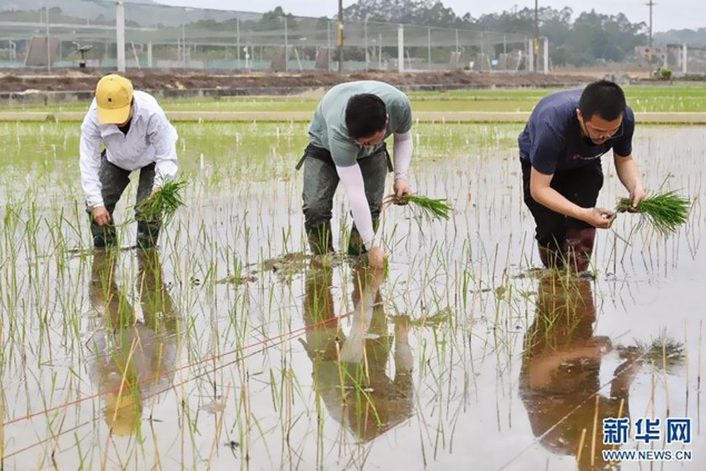 研究人員在廣州增城華南農(nóng)業(yè)大學試驗田插種嫦娥五號搭載的太空稻秧苗。