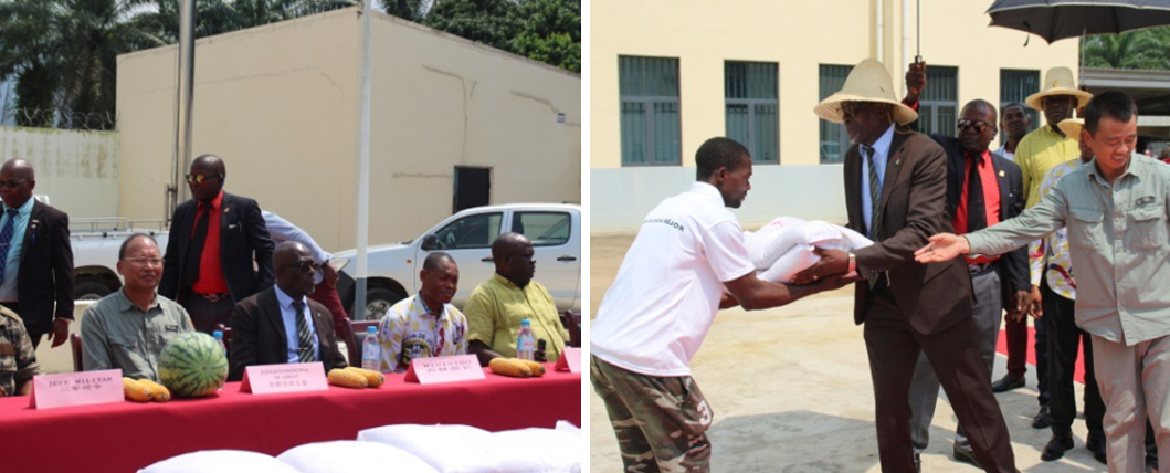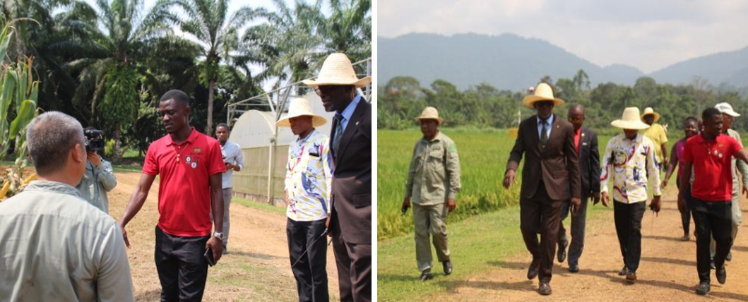 2019年12月20日上午,在圣誕佳節(jié)來臨之際,赤道幾內(nèi)亞農(nóng)業(yè)、畜牧、森林和環(huán)境部部長阿卡波攜當?shù)靥厣撂禺a(chǎn)慰問示范農(nóng)場水稻專家陳大洲和項目組。農(nóng)林部官員、涅方市各級領(lǐng)導、巴塔及涅方電視臺新聞記者等陪同。